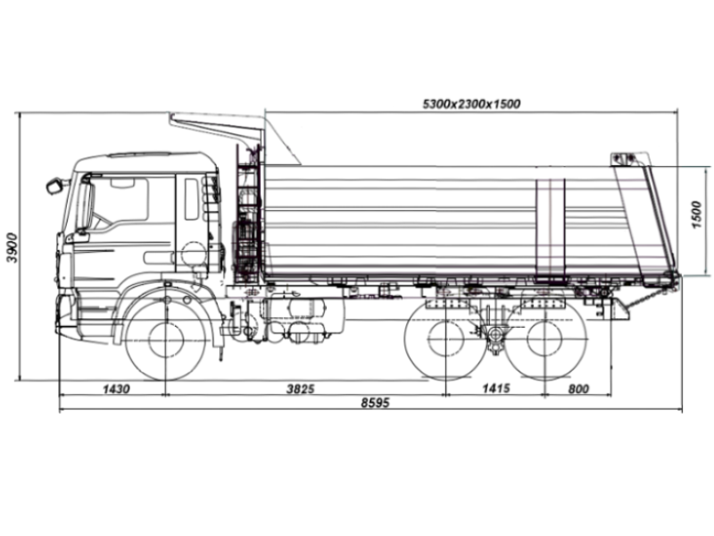 Объем 18 куб.м Обогрев кузова выхлопными газами Размер кузова 5300*2300*1500 мм Материал кузова износостойкая сталь K450, пол 7 мм, борта 5 мм Гидрооборудование HYVA Крепление запасного колеса с лебедкой подъёма на передней стенке кузова Автоматические замки заднего борта, лестница